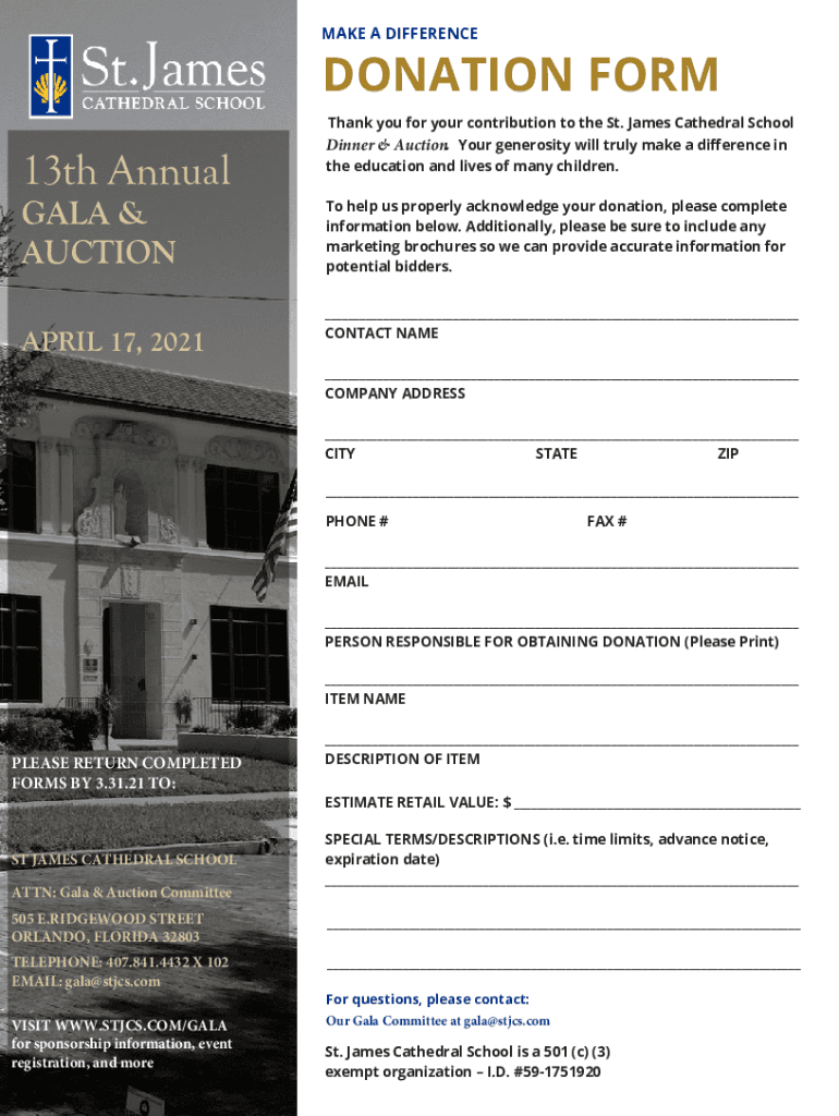 MAKE A DIFFERENCEDONATION FORM Thank you for your contribution to the St. James Cathedral School13th Annual GALA & AUCTIONAPRIL 17, 2021Dinner & Auction. Your generosity will truly make a difference