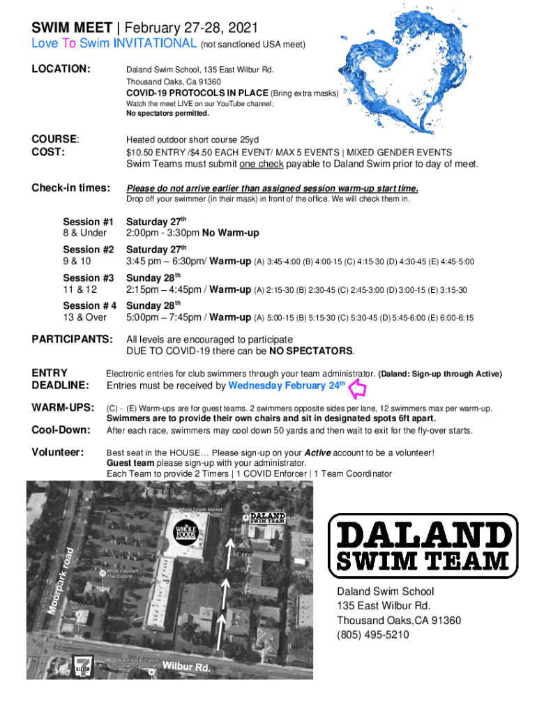 SWIM MEET February 2728, 2021 Love To Swim INVITATIONAL (not sanctioned USA meet) LOCATION:Åland Swim School, 135 East Wilbur Rd. Thousand Oaks, Ca 91360 COVID-19 PROTOCOLS IN PLACE (Bring extra