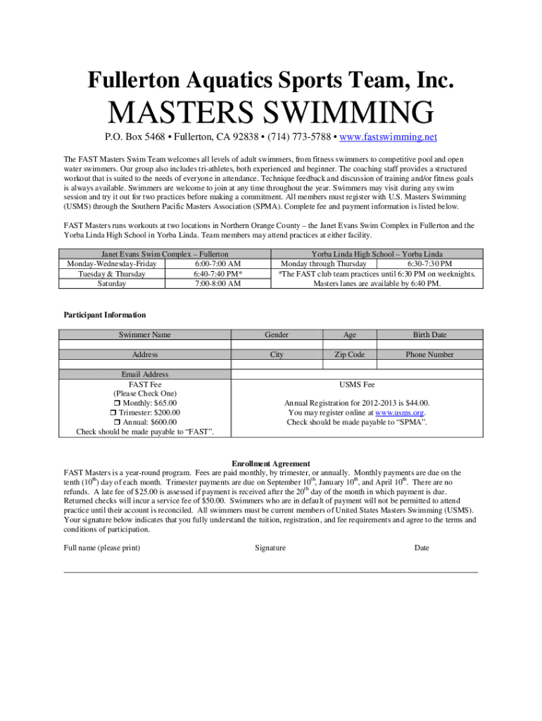 Fullerton Aquatics Sports Team, Inc. MASTERS SWIMMING P.O. Box 5468 Fullerton, CA 92838 (714) 7735788 www.fastswimming.net The FAST Masters Swim Team welcomes all levels of adult swimmers, from fitness