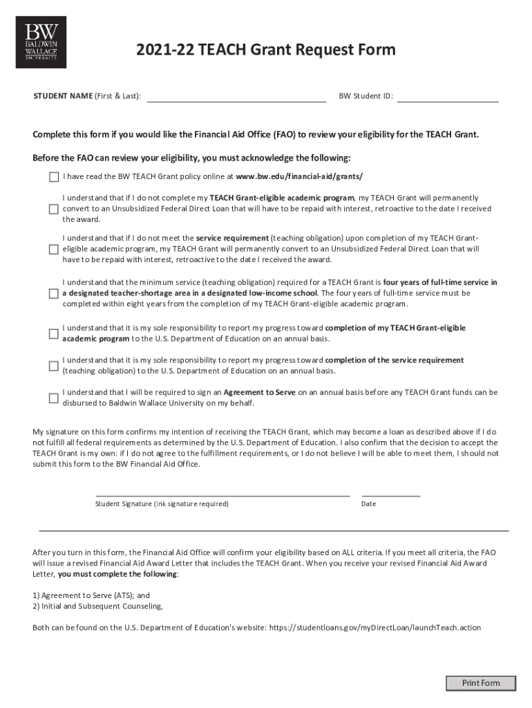 Get the free BW 2021-22 TEACH Grant Request Form
