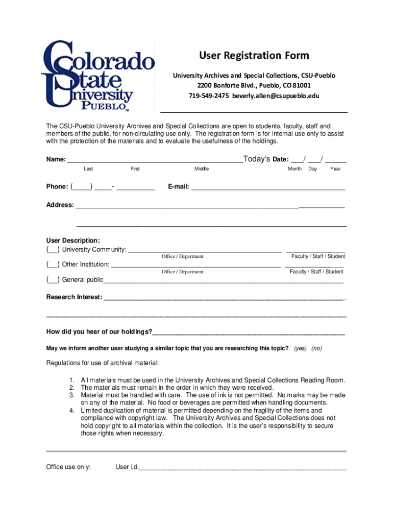 User Registration Form University Archives and Special Collections, CSU Pueblo 2200 Bonfire Blvd., Pueblo, CO 81001 7195492475 Beverly. Allen Pueblo. Edith CSU Pueblo University Archives and Special