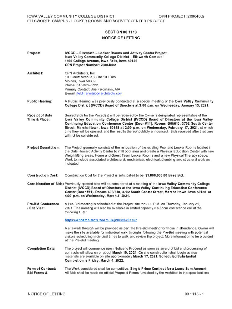 IOWA VALLEY COMMUNITY COLLEGE DISTRICT ON PROJECT: 20804002 ELLSWORTH CAMPUS LOCKER ROOMS AND ACTIVITY CENTER PROJECT SECTION 00 1113 NOTICE OF LETTINGProject:IV CCD Ellsworth Locker Rooms and Activity