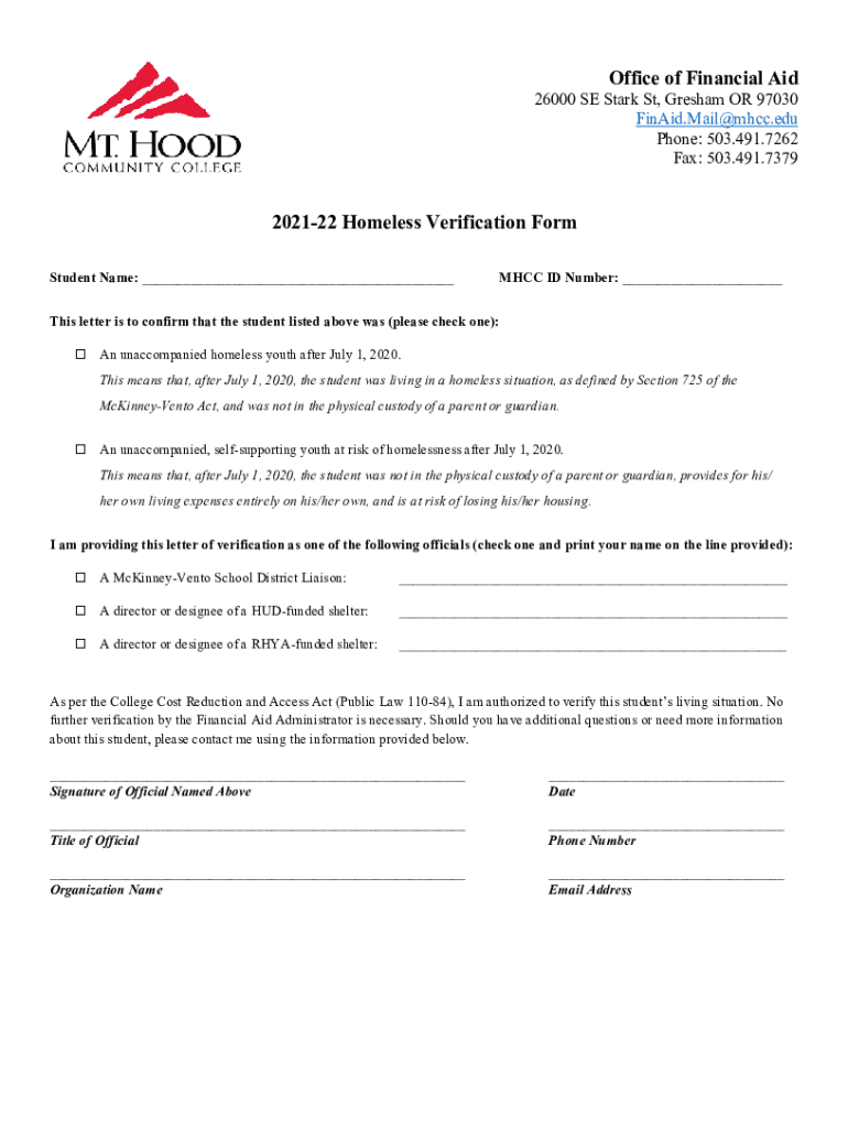 Office of Financial Aid26000 SE Stark St, Gresham OR 97030 Final. Mail MHC.edu Phone: 503.491.7262 Fax: 503.491.7379202122 Homeless Verification Form Student Name: MHC ID Number: This letter is to