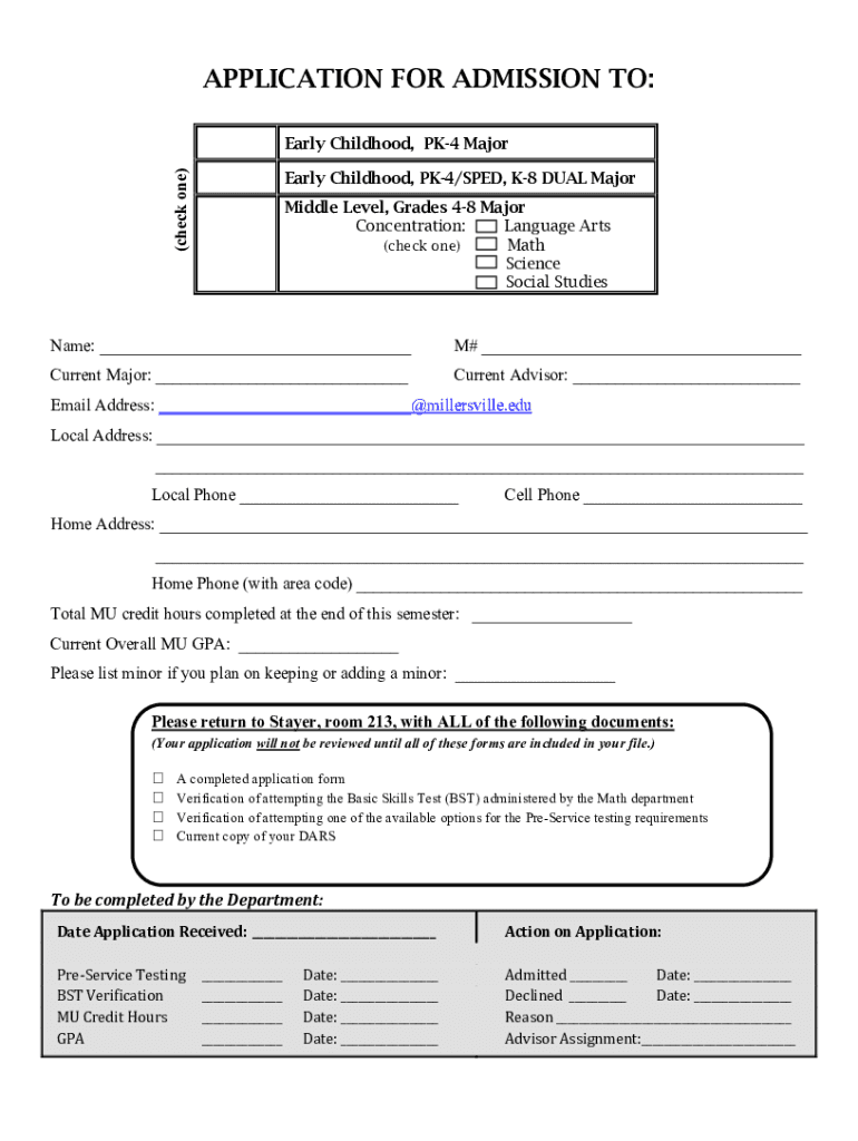 APPLICATION FOR ADMISSION TO:(check one)Early Childhood, PK4 Major Early Childhood, PK4/SPED, K8 DUAL Major Middle Level, Grades 48 Major Concentration: Language Arts (check one) Math Science Social