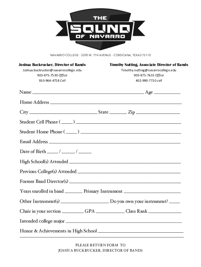NAVARRO COLLEGE 3200 W. 7TH AVENUE CORSICAN, TEXAS 75110Joshua Backpacker, Director of Bands Timothy Nutting, Associate Director of Bands Joshua. Backpacker navarrocollege.edu 9038757530Office 9109644758CellTimothy.