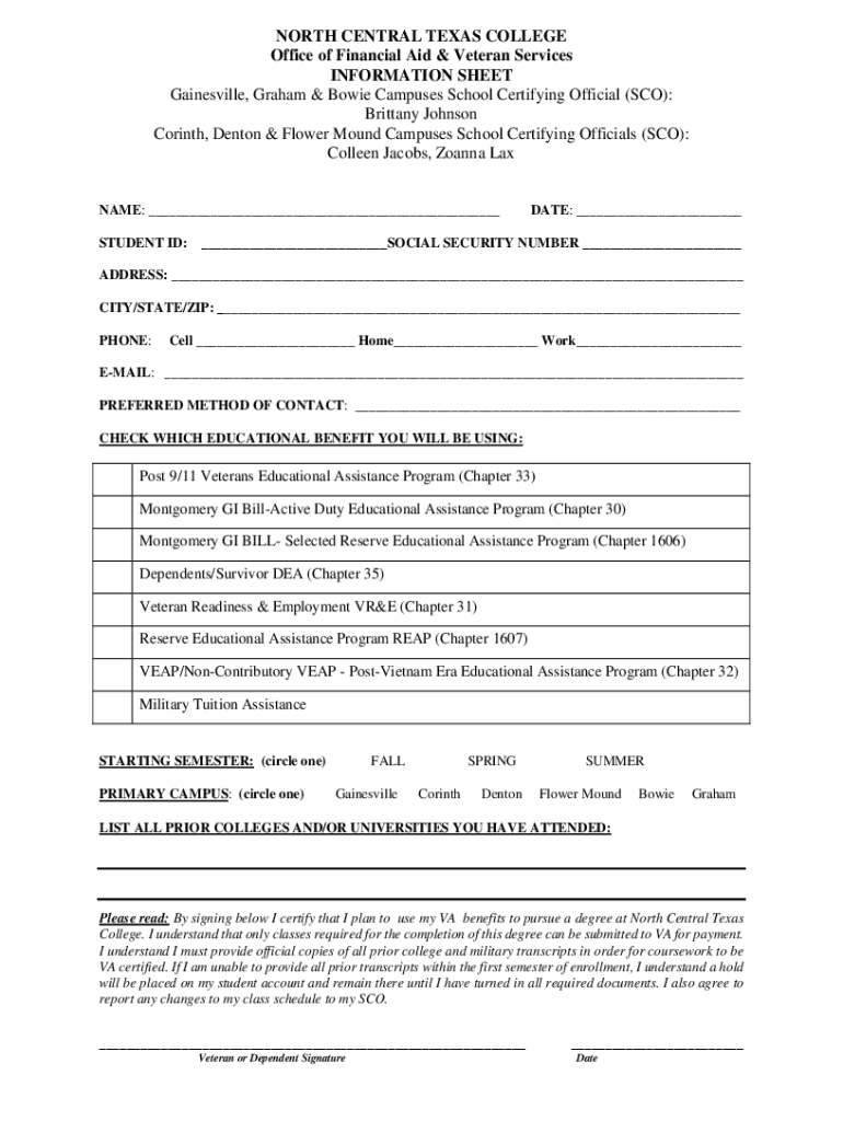 NORTH CENTRAL TEXAS COLLEGE Office of Financial Aid & Veteran Services INFORMATION SHEET Gainesville, Graham & Bowie Campuses School Certifying Official (SCO): Brittany Johnson Corinth, Denton & Flower