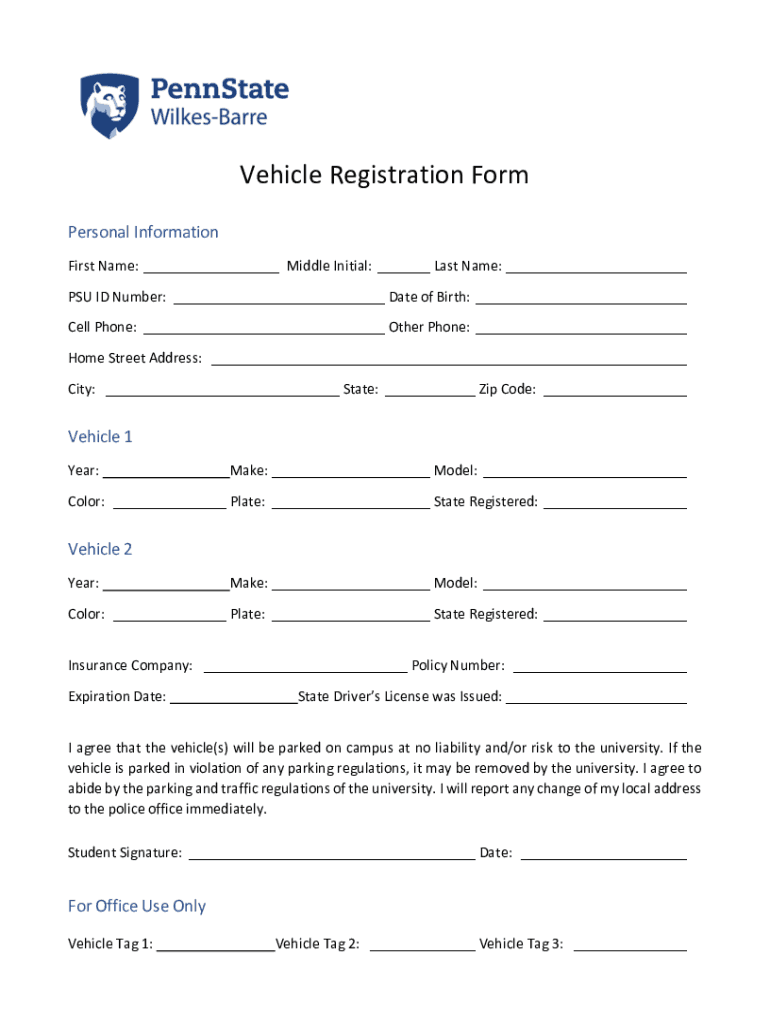 Vehicle Registration Form Personal Information First Name: Middle Initial: Last Name: PSU ID Number: Date of Birth: Cell Phone: Other Phone: Home Street Address: City: State: Zip Code: Vehicle 1 Year:Make: