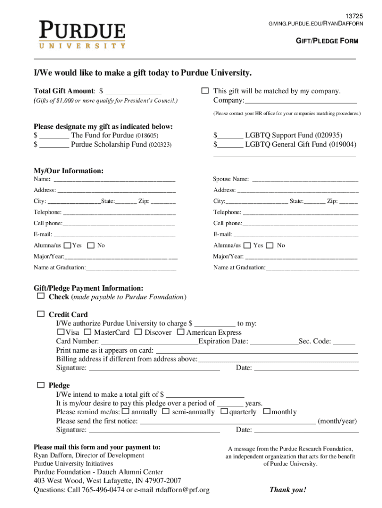 13725 GIVING.PURDUE.EDU/RYANDAFFORNGIFT/PLEDGE FORM I/We would like to make a gift today to Purdue University. Total Gift Amount: $ (Gifts of $1,000 or more qualify for Presidents Council.) This gift