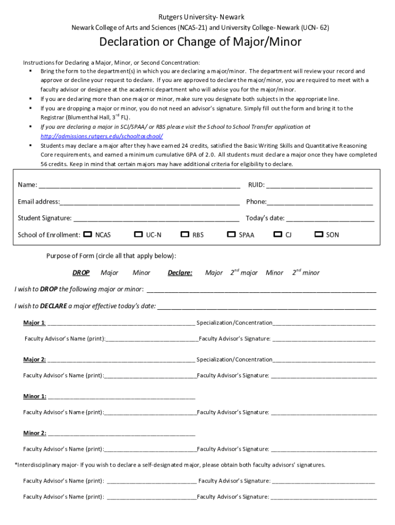 Rutgers University Newark College of Arts and Sciences (NCAS21) and University College Newark (UNC 62)Declaration or Change of Major/Minor Instructions for Declaring a Major, Minor, or Second Concentration: