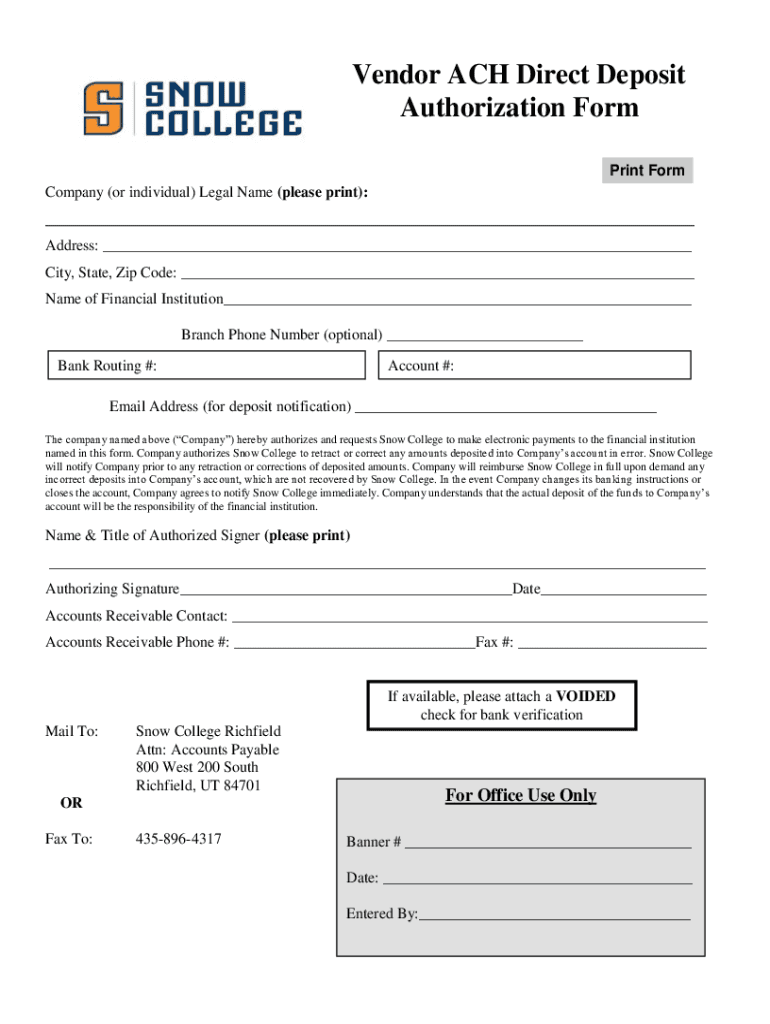 Get the free Vendor ACH Direct Deposit Authorization Form - snow.edu
