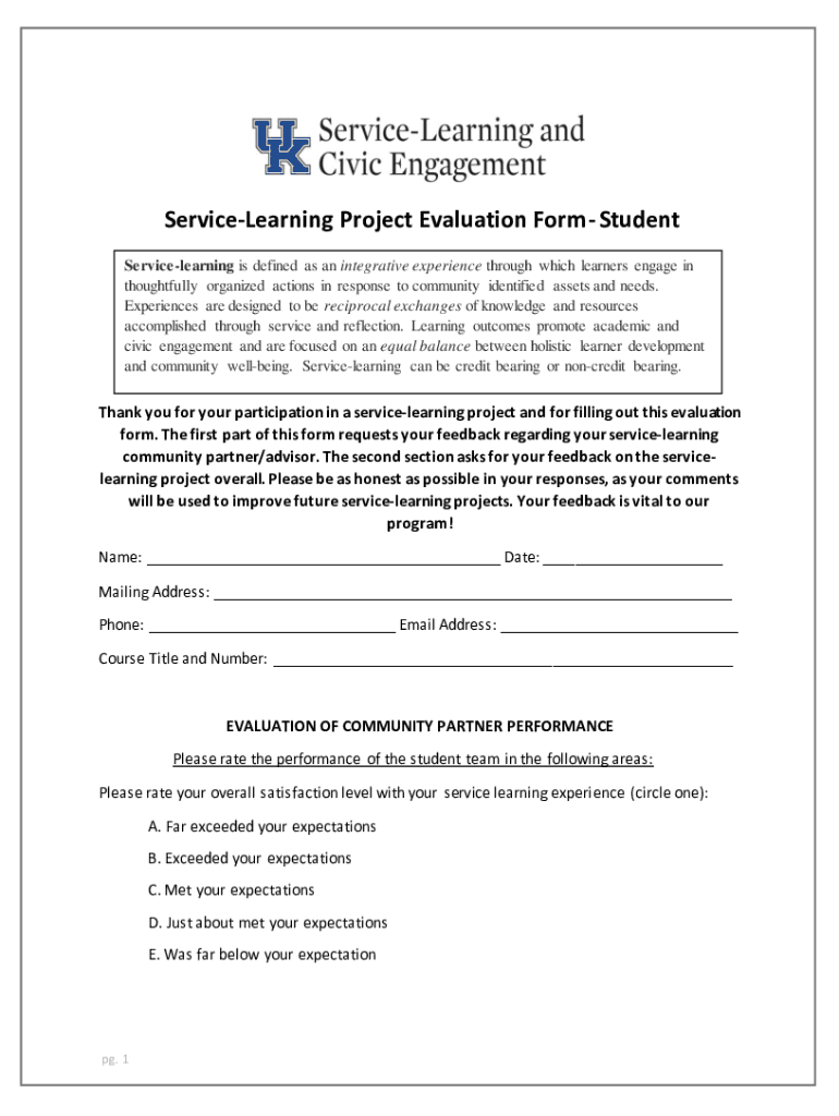 Anyone involved in a service-learning project may need a service-learning project evaluation form. This includes: