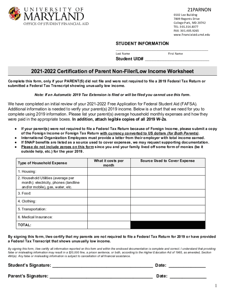 Get the free 2 0 2 1 -2 0 2 2 C e r ti fi c a ti o n o f P a r e n t N ... - financialaid umd