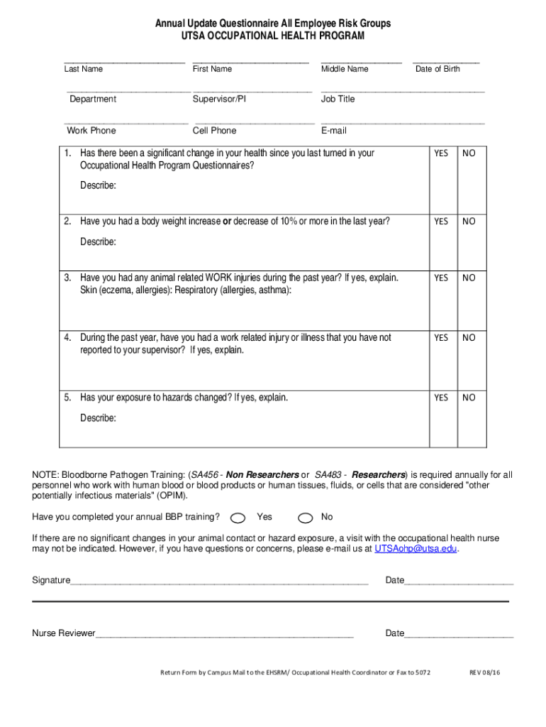 Get the free Annual Update Questionnaire All Employee Risk Groups UTSA ...