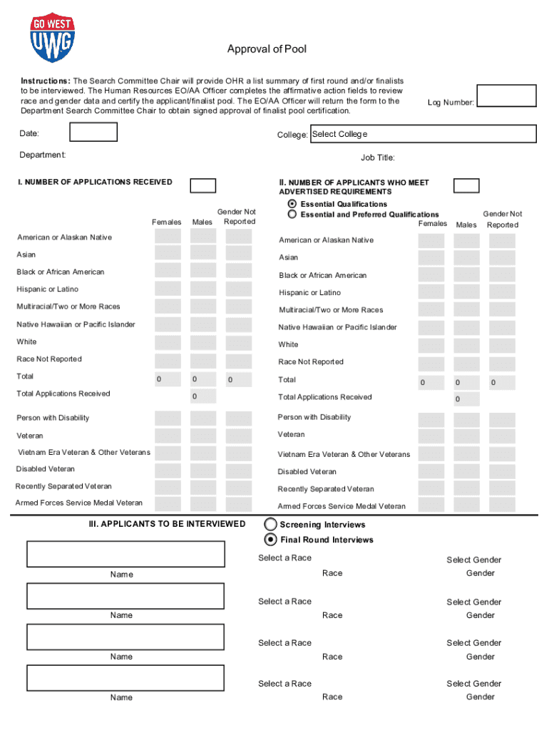 Print Form Save Preapproval of Pool Instructions: The Search Committee Chair will provide OR a list summary of first round and/or finalists to be interviewed. The Human Resources EO/AA Officer completes
