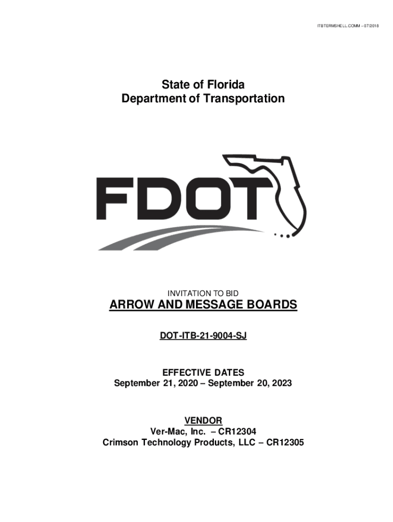 ITBTERMSHELL.COMM 07/2018State of Florida Department of TransportationINVITATION TO BARROW AND MESSAGE BOARDS DOTITB219004SJEFFECTIVE DATES September 21, 2020, September 20, 2023VENDOR German, Inc.