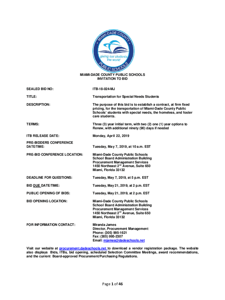SEALED BID NO:ITB18024MJTITLE:Transportation for Special Needs StudentsDESCRIPTION:The purpose of this bid is to establish a contract, at firm fixed