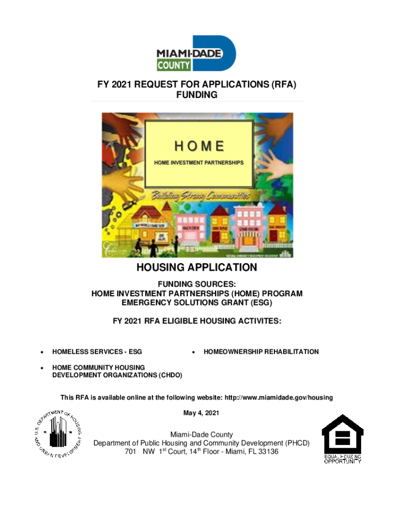 FY 2021 REQUEST FOR APPLICATIONS (RFA) FUNDINGHOUSING APPLICATION FUNDING SOURCES: HOME INVESTMENT PARTNERSHIPS (HOME) PROGRAM EMERGENCY SOLUTIONS GRANT (ESG) FY 2021 RFA ELIGIBLE HOUSING ACTIVITIES:HOMELESS