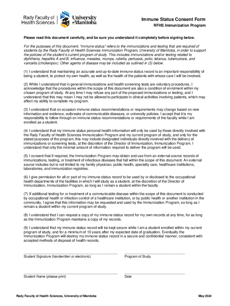 Get the free Immune Status Consent Form - University of Manitoba