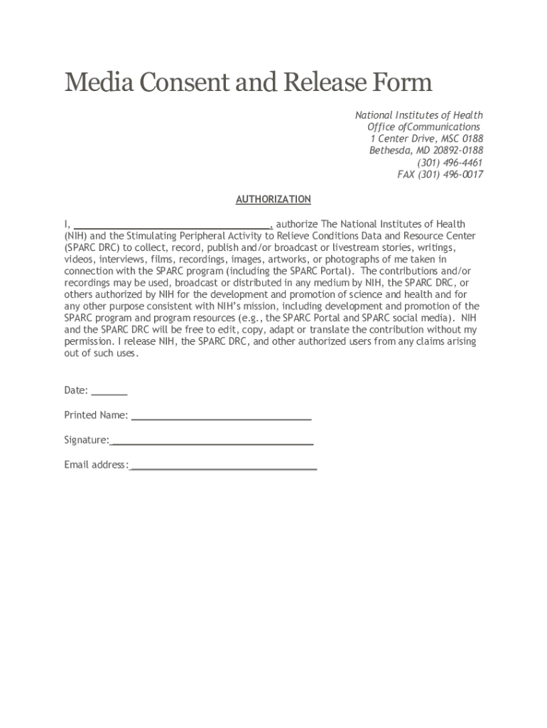 Media Consent and Release Form National Institutes of Health Office of Communications 1 Center Drive, MSC 0188 Bethesda, MD 208920188 (301) 4964461 FAX (301) 4960017 AUTHORIZATION I, authorize The
