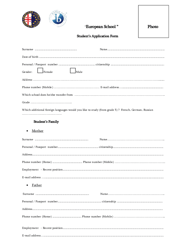 European School PhotoStudents Application FormSurname ....................................................... Name........................................................................... Date of