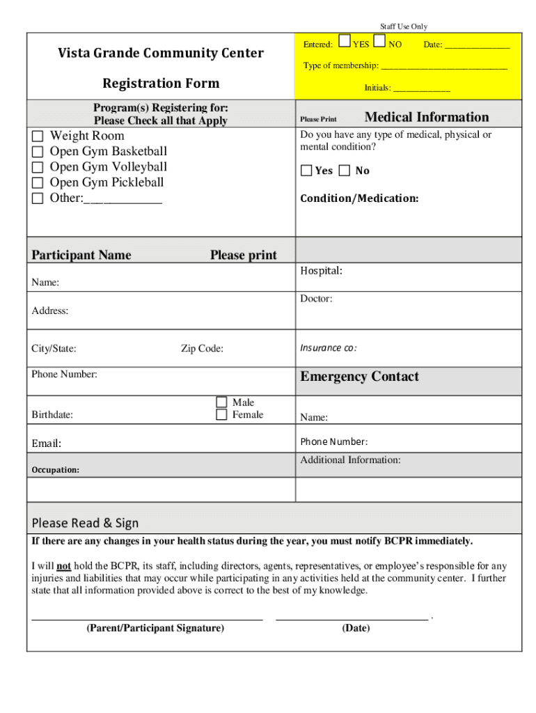 Staff Use OnlyVista Grande Community CenterEntered:Renovate: Type of membership: Registration FormInitials: Program(s) Registering for: Please Check all that Apply you have any type of medical, physical