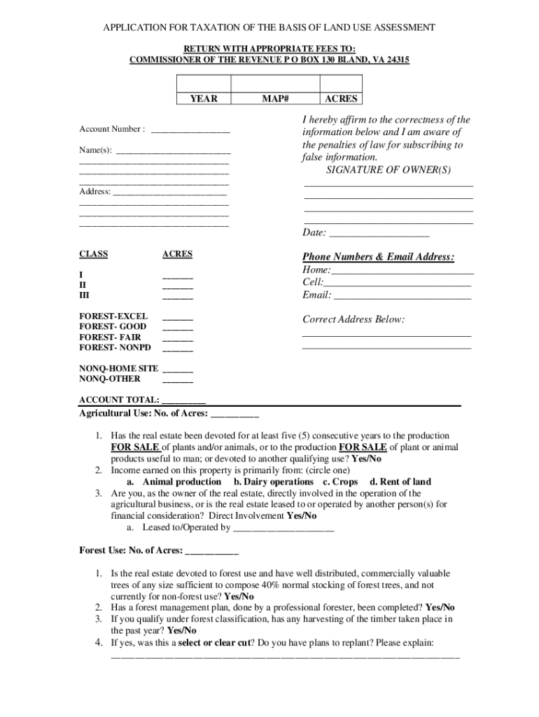 APPLICATION FOR TAXATION OF THE BASIS OF LAND USE ASSESSMENT RETURN WITH APPROPRIATE FEES TO: COMMISSIONER OF THE REVENUE P O BOX 130 BLAND, VA 24315YEAR Account Number : Name(s): Address: MAP#ACRES