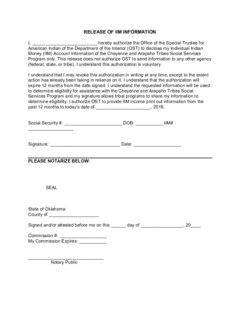 RELEASE OF IIM INFORMATION I, hereby authorize the Office of the Special Trustee for American Indian of the Department of the Interior (OST) to disclose my Individual Indian Money (IIM) Account Information