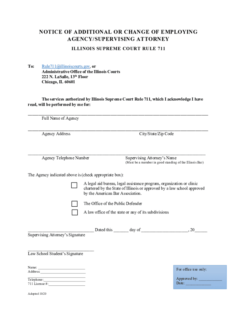 NOTICE OF ADDITIONAL OR CHANGE OF EMPLOYING AGENCY/SUPERVISING ATTORNEY ILLINOIS SUPREME COURT RULE 711 To:Rule711 illinoiscourts.gov, or Administrative Office of the Illinois Courts 222 N. Basally,