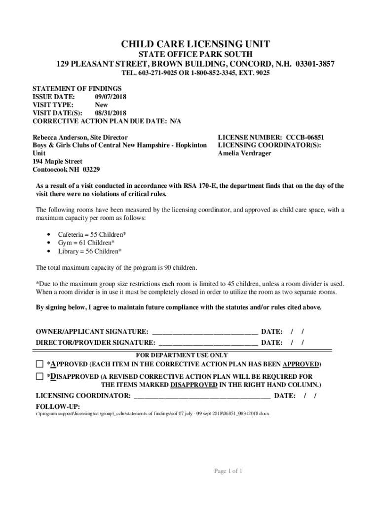 CHILD CARE LICENSING UNIT STATE OFFICE PARK SOUTH 129 PLEASANT STREET, BROWN BUILDING, CONCORD, N.H. 033013857 TEL. 6032719025 OR 18008523345, EXT. 9025 STATEMENT OF FINDINGS ISSUE DATE: 09/07/2018