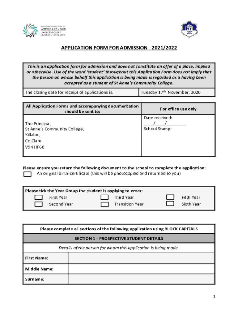APPLICATION FORM FOR ADMISSION 2021/2022This is an application form for admission and does not constitute an offer of a place, implied or otherwise. Use of the word student throughout this Application