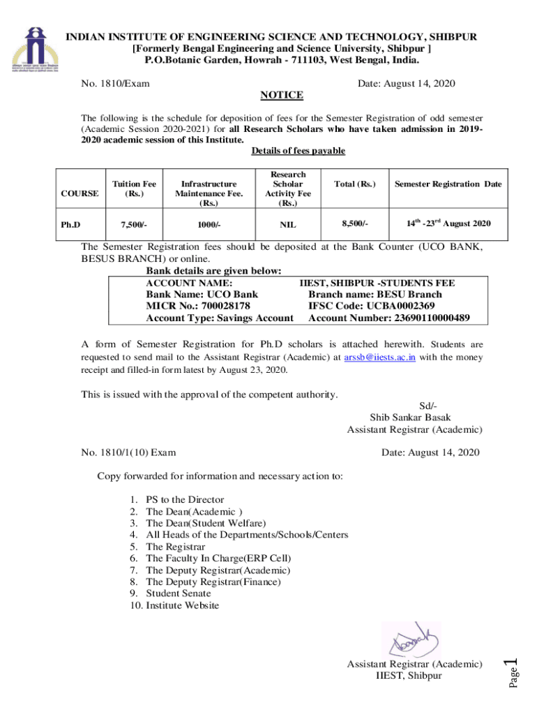INDIAN INSTITUTE OF ENGINEERING SCIENCE AND TECHNOLOGY, SHIPPER Formerly Bengal Engineering and Science University, Shipper P.O. Botanic Garden, Howrah 711103, West Bengal, India. No. 1810/Exudate: