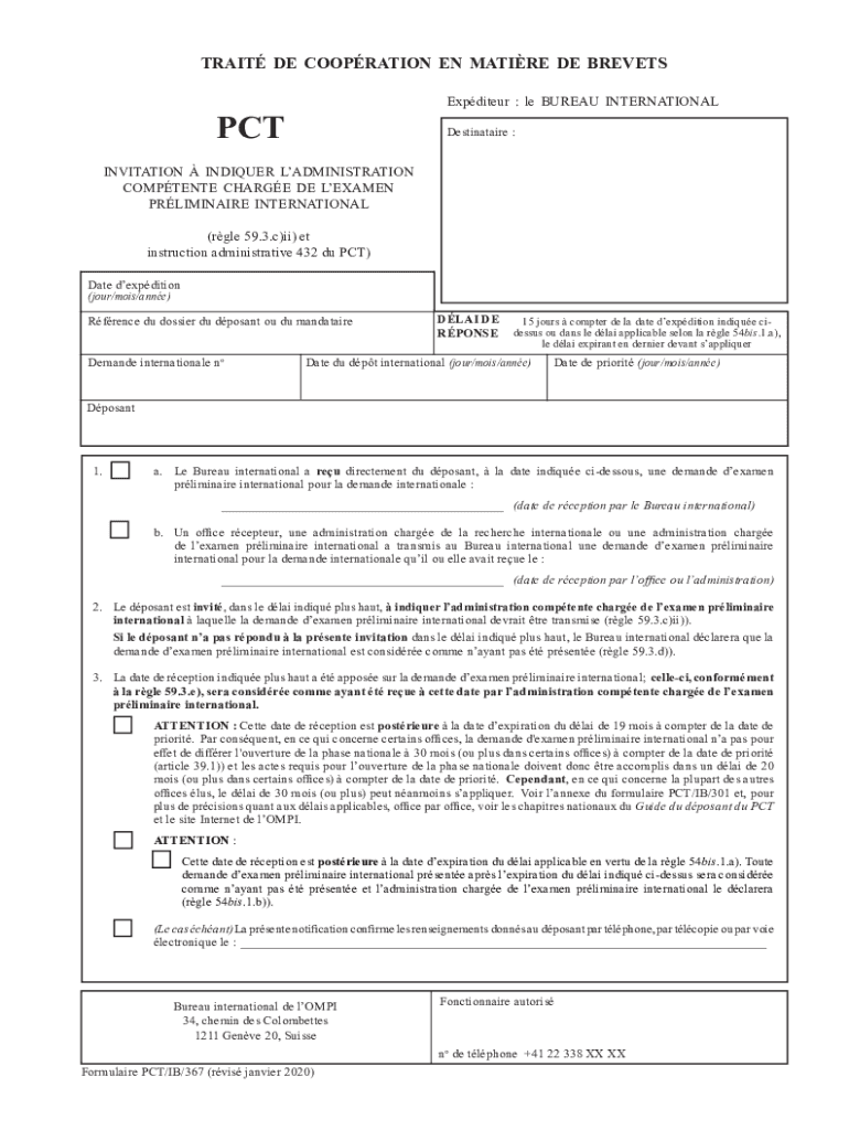 TRAIT DE COOPERATION EN MATURE DE BREVETS Expediter : LE BUREAU INTERNATIONALPCTDestinataire :INVITATION UNIQUER ADMINISTRATION COMPLETE CHARGE DE EXAMEN PRELIMINARY INTERNATIONAL (role 59.3.c)ii)
