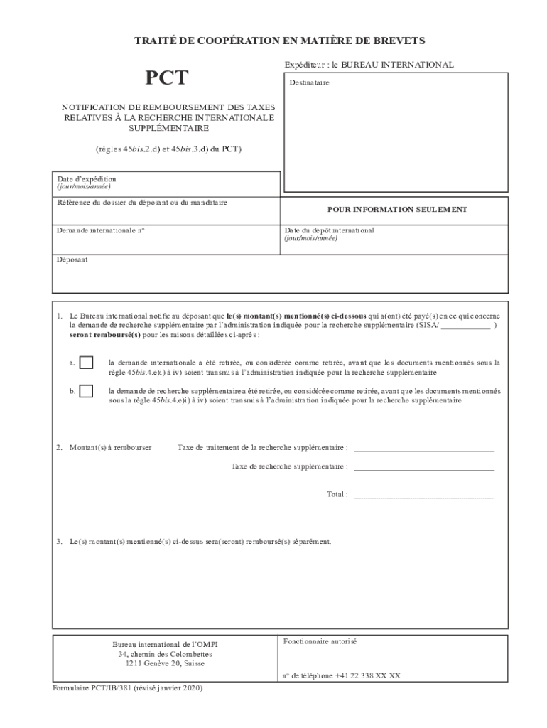 TRAIT DE COOPERATION EN MATURE DE BREVETS Expediter : LE BUREAU INTERNATIONALPCTDestinataireNOTIFICATION DE REIMBURSEMENT DES TAXES RELATIVES LA Recherché INTERNATIONALE SUPPLEMENTARY (rules 45bis.2.d)
