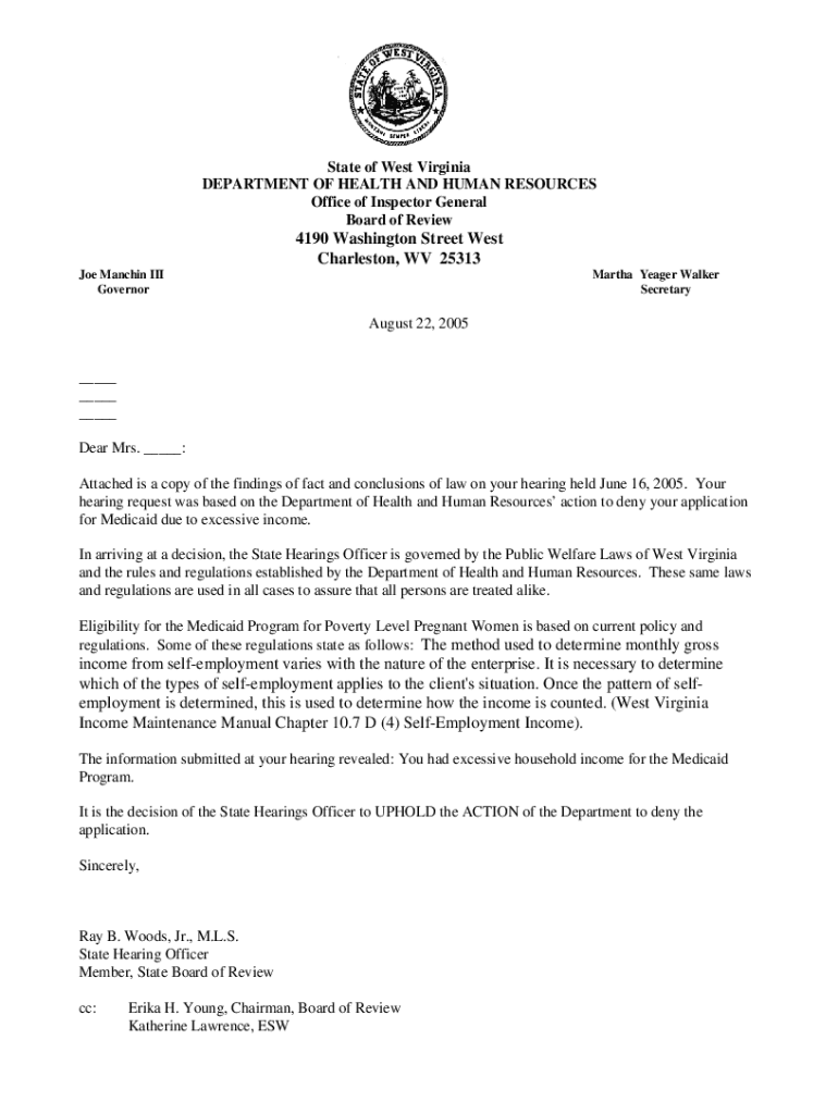 State of West Virginia DEPARTMENT OF HEALTH AND HUMAN RESOURCES Office of Inspector General Board of Review4190 Washington Street West Charleston, WV 25313 Joe Man chin III Governor Martha Yeager