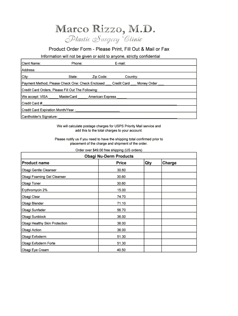 The Product Order Form is a purchase order template used by clients to order Obagi Nu-Derm and other skincare products from Marco Rizzo, M.D. Plastic & Reconstructive Surgery.