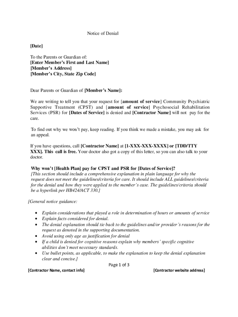 Notice of Denial Date To the Parents or Guardian of: Enter Members First and Last Name Members Address Members City, State Zip Code Dear Parents or Guardian of Members Name : We are writing to tell