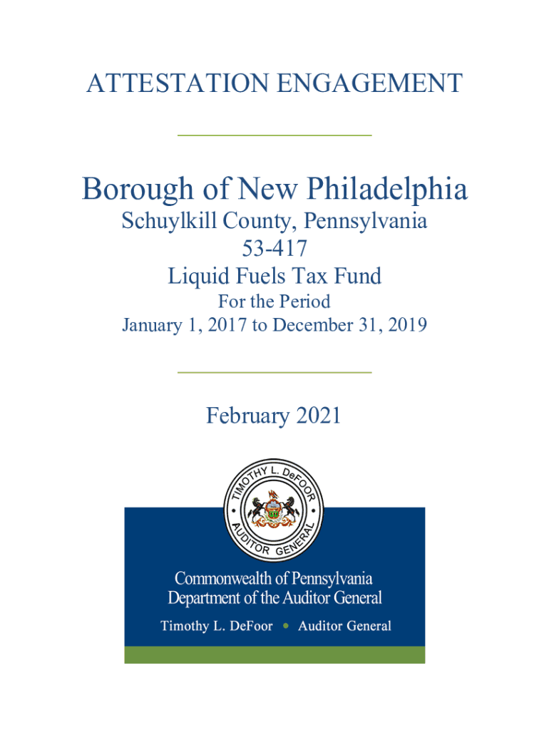 ATTESTATION ENGAGEMENT Borough of New Philadelphia Schuylkill County, Pennsylvania 53417 Liquid Fuels Tax Fund For the Period January 1, 2017, to December 31, 2019, February 2021Independent Auditors