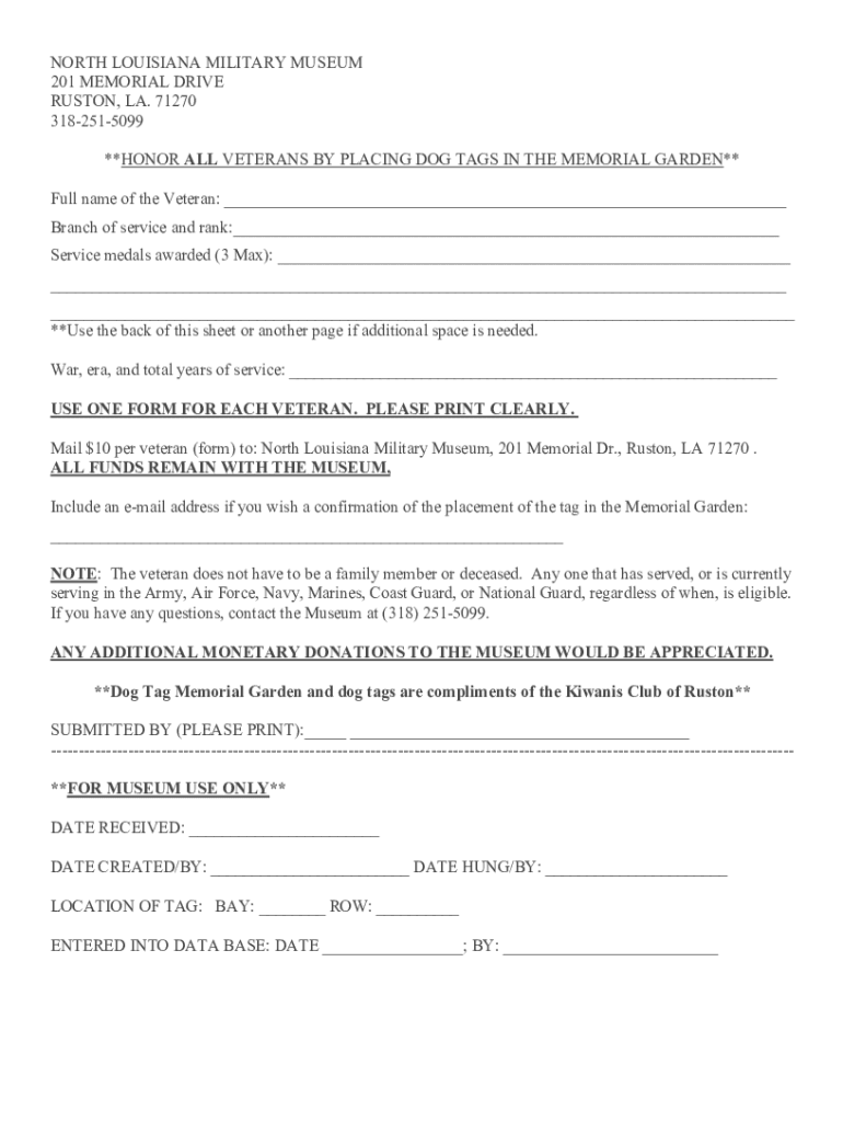 NORTH LOUISIANA MILITARY MUSEUM 201 MEMORIAL DRIVE HUSTON, LA. 71270 3182515099 **HONOR ALL VETERANS BY PLACING DOG TAGS IN THE MEMORIAL GARDEN** Full name of the Veteran: Branch of service and rank: