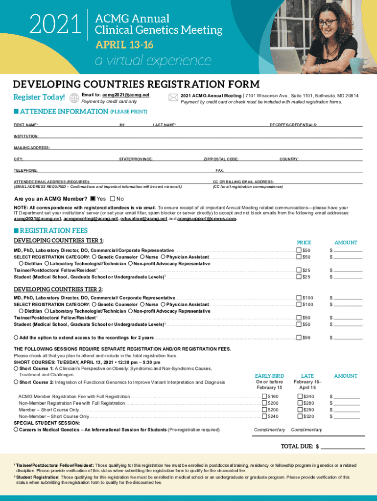 DEVELOPING COUNTRIES REGISTRATION FORM Register Today!2021 ACM Annual Meeting 7101 Wisconsin Ave., Suite 1101, Bethesda, MD 20814 Payment by credit card or check must be included with mailed registration