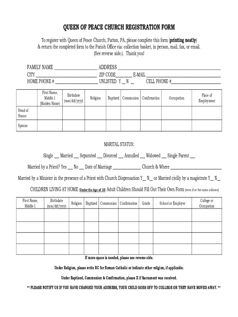 QUEEN OF PEACE CHURCH REGISTRATION FORM To register with Queen of Peace Church, Patton, PA, please complete this form (printing neatly) & return the completed form to the Parish Office via: collection