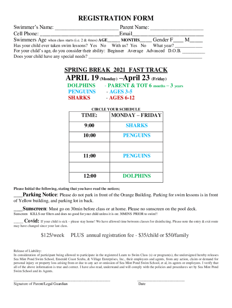 REGISTRATION FORM Swimmers Name: Parent Name: Cell Phone: Email Swimmers Age when class starts (i.e. 2 & 4mos) AGE MONTHS Gender F M Has your child ever taken swim lessons? Yes No With us? Yes No