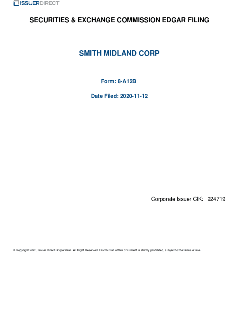 SECURITIES & EXCHANGE COMMISSION EDGAR FILINGSMITH MIDLAND Conform: 8A12B Date Filed: 20201112Corporate Issuer CIK: 924719 Copyright 2020, Issuer Direct Corporation. All Right Reserved. Distribution