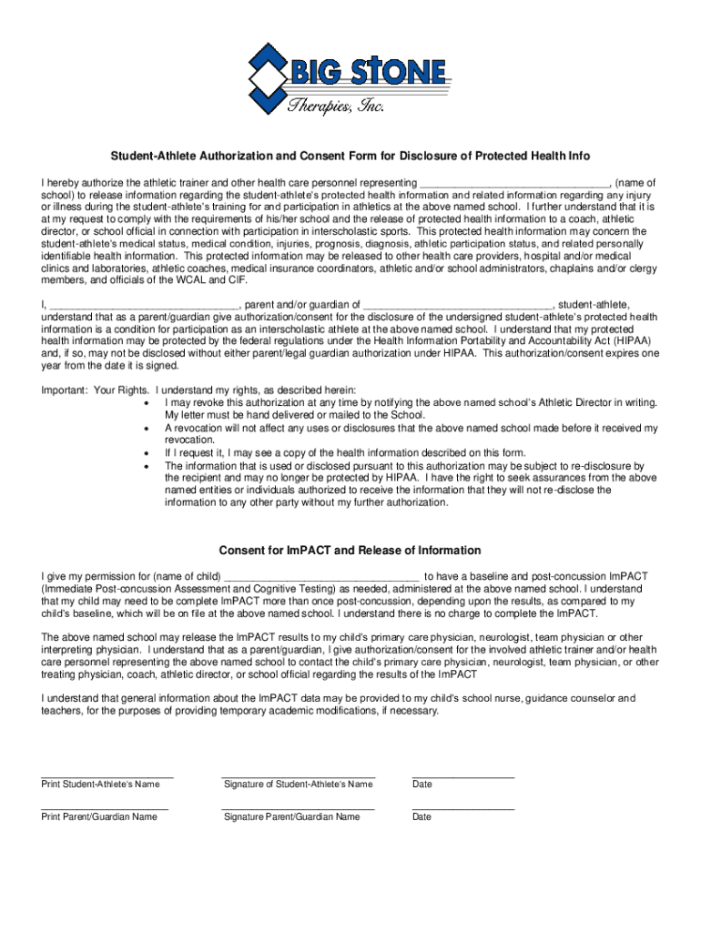 StudentAthlete Authorization and Consent Form for Disclosure of Protected Health Info I hereby authorize the athletic trainer and other health care personnel representing, (name of school) to release