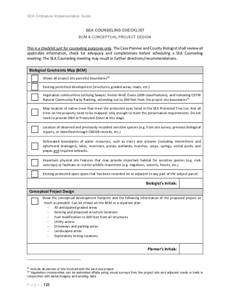 SEA Ordinance Implementation GuideAPPENDIX D: SEA CHECKLISTS & WORKSHEETS1 SEA COUNSELING CHECKLISTS 2 BIOLOGICAL CONSTRAINTS ANALYSIS (BCA) CHECKLIST 3 IOTA REPORT CHECKLIST a g e 122SEA Ordinance