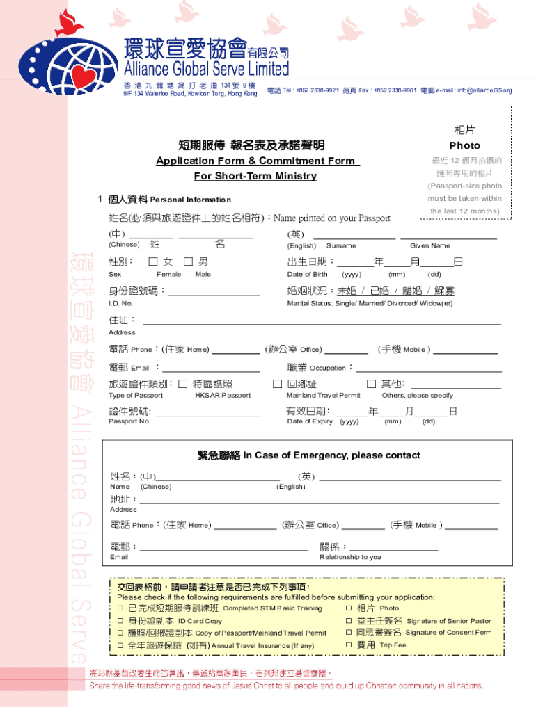 134 9 9/F 134 Waterloo Road, Kowloon Tong, Hong Kong Tel : +852 23389921 Fax : +852 23389961 email : info alliances.org PhotoApplication Form & Commitment Form 12 For Shorter Ministry (Passport size
