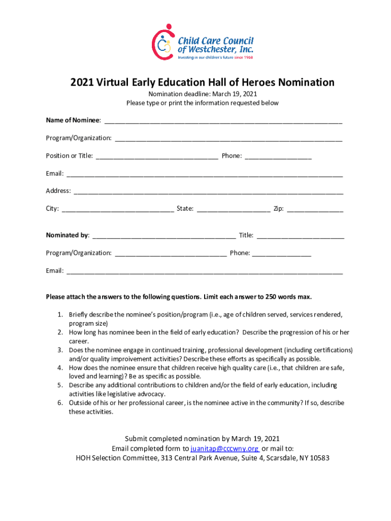 2021 Virtual Early Education Hall of Heroes Nomination deadline: March 19, 2021, Please type or print the information requested below Name of Nominee: Program/Organization: Position or Title: Phone: