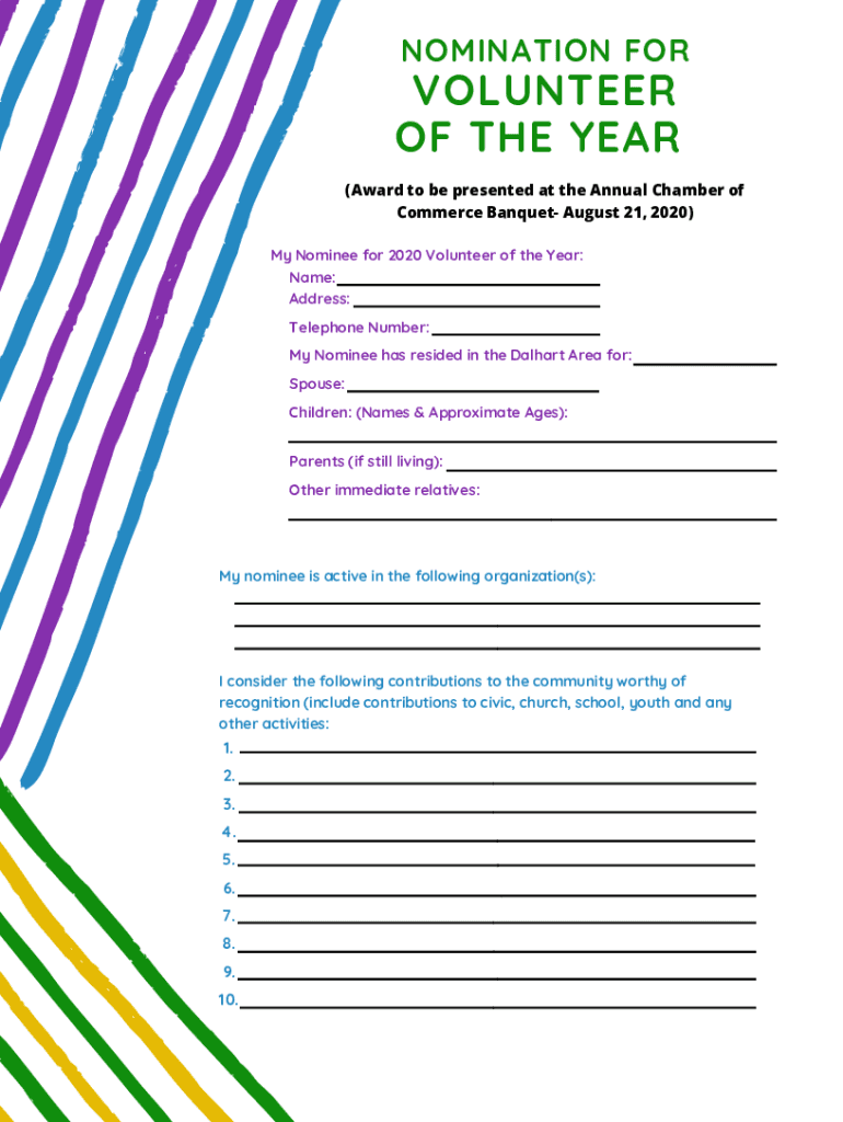NOMINATION VOLUNTEER OF THE YEAR(Award to be presented at the Annual Chamber of Commerce Banquet August 21, 2020) My Nominee for 2020 Volunteer of the Year: Name: Address: Telephone Number: My Nominee