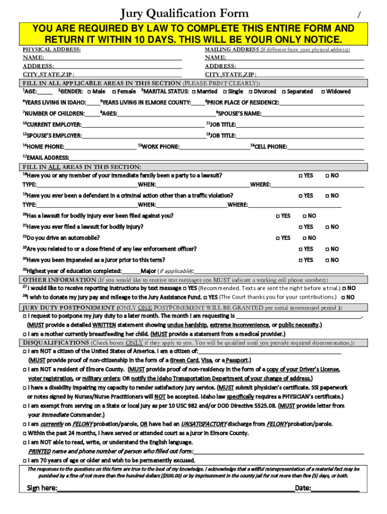 Jury Qualification Form/YOU ARE REQUIRED BY LAW TO COMPLETE THIS ENTIRE FORM AND RETURN IT WITHIN 10 DAYS. THIS WILL BE YOUR ONLY NOTICE. PHYSICAL ADDRESS:MAILING ADDRESS (If different from your physical