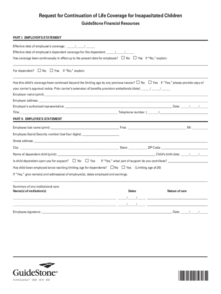 Request for Continuation of Life Coverage for Incapacitated Children Guide Stone Financial Resources Reset Form PART I: EMPLOYERS STATEMENT Effective date of employees coverage: / / Effective date