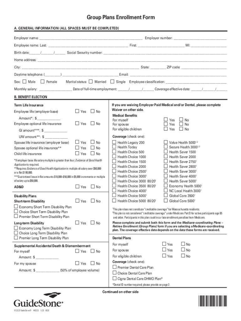 Group Plans Enrollment Form Reset Form. GENERAL INFORMATION (ALL SPACES MUST BE COMPLETED)Employer name: Employer number: Employee name: Last: First: MI: Birth date: / / Social Security number: Home